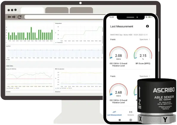 El ABLE Handy de ASCRIBO® es un vibrómetro inteligente y analizador de la salud de rodamientos que utiliza un sensor de temperatura y vibración MEMS triaxial, totalmente inalámbrico, y funciona con teléfonos inteligentes.